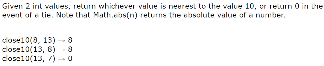 Given 2 int values, return whichever value is nearest to the value 10, or return 0 in the event of a tie. Note that Math.abs(n) returns the absolute value of a number.close10(8, 13) → 8close10(13, 8) → 8close10(13, 7) → 0Go...Save, Compile, Run (ctrl