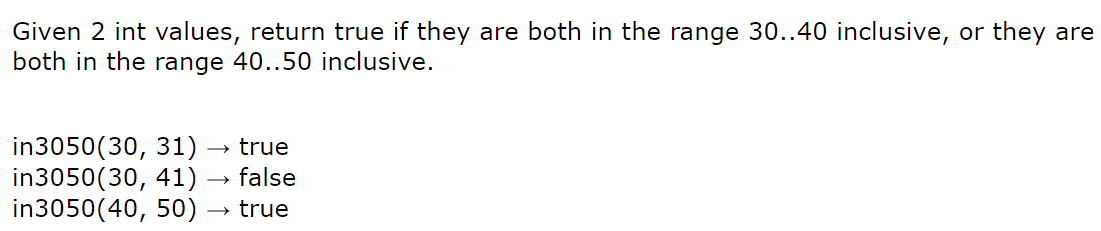 Given 2 int values, return true if they are both in the range 30..40 inclusive, or they are both in the range 40..50 inclusive.in3050(30, 31) → truein3050(30, 41) → falsein3050(40, 50) → trueGo...Save, Compile, Run (ctrl-enter)Show Solution
