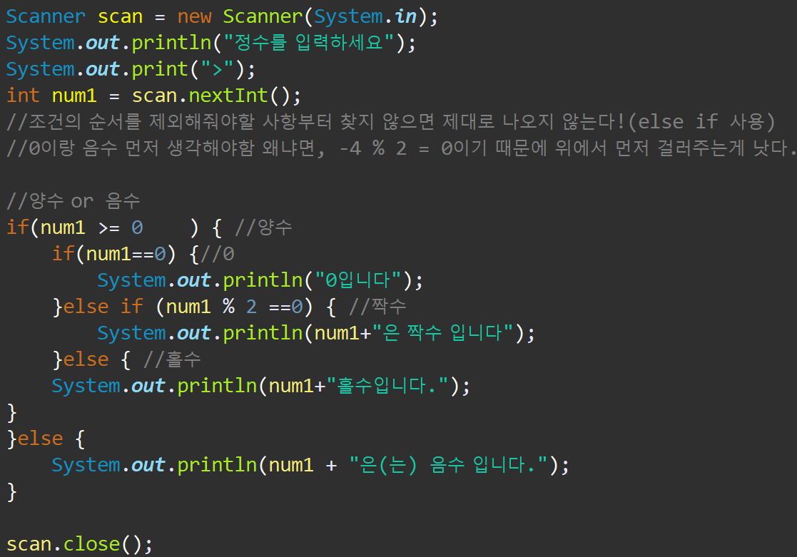 //조건의 순서를 제외해줘야할 사항부터 찾지 않으면 제대로 나오지 않는다!(else if 사용)