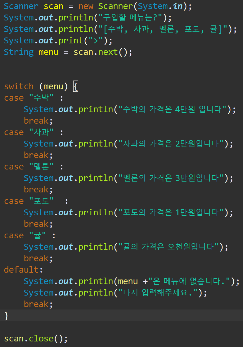 메뉴 중 원하는 과일이 없다면, "입력한 과일은 메뉴에 없습니다."라고 출력 나오게 하기.