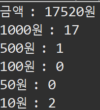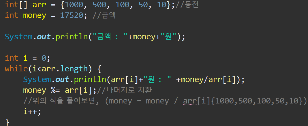 //위의 식을 풀어보면, (money = money / arr[i]{1000,500,100,50,10})