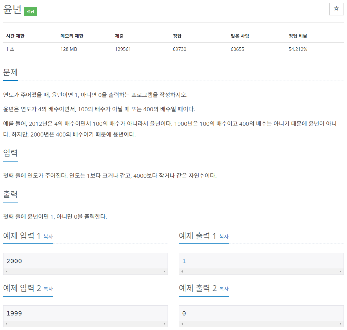 연도가 주어졌을 때, 윤년이면 1, 아니면 0을 출력하는 프로그램을 작성하시오. 윤년은 연도가 4의 배수이면서, 100의 배수가 아닐 때 또는 400의 배수일 때이다. 예를 들어, 2012년은 4의 배수이면서