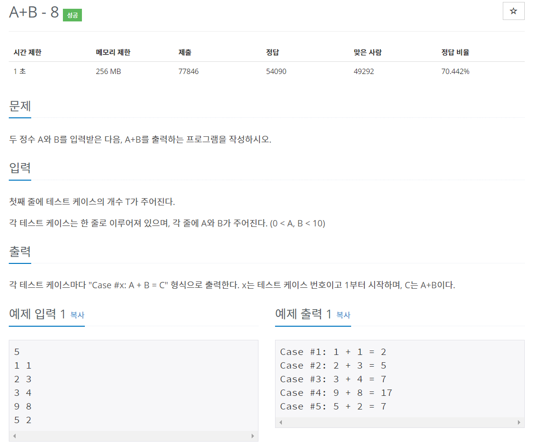 11021번 문제에서 출력값만 수정하면 되는 문제여서, 추가적으로 어려움은 없는 문제이다.